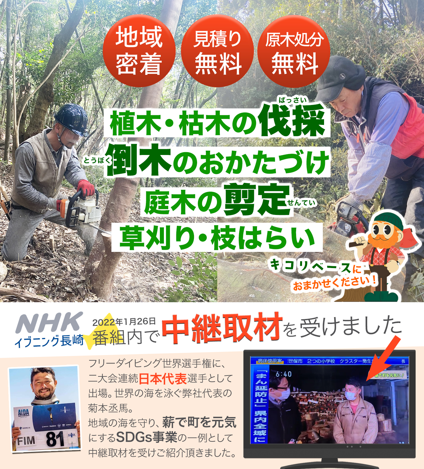 私たちは長崎県波佐見町で、植木・枯木の伐採、間伐、倒木の撤去、庭木の剪定、草払い(草刈り)、枝払いなど、樹木に関すること全般をお任せいただいております、プロの木こり集団です。